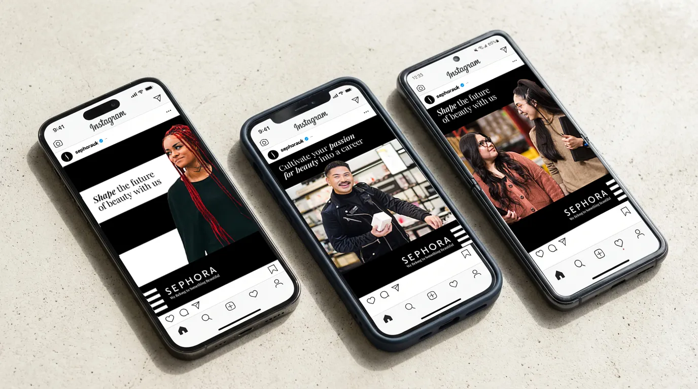 Leveraging Sephora’s iconic black-and-white stripes, this project focused on crafting bold, visually engaging content that embodies the brand’s core values. From design and messaging frameworks to photography direction, the goal was to ensure every campaign element aligns seamlessly with Sephora’s distinctive aesthetic and voice. The work provided clear creative guidance to shape how the campaigns look, feel, and resonate with audiences, all executed the Sephora way.