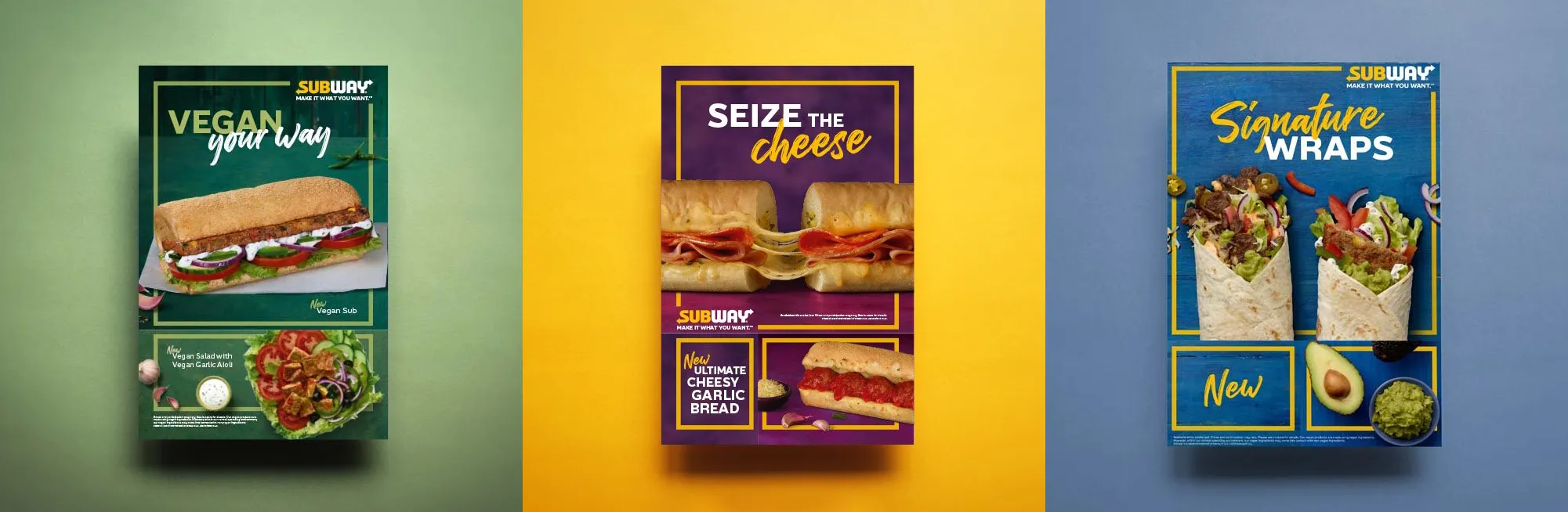 'Double the feel good' Creating a raft of surreal depictions of "doubling up" to promote a two-for-one offer on World Sandwich Day, a TV spot featuring singing tomatoes was supported by gifs for social featuring breakdancing robots, jazz drumming cats and exploding sumo wrestlers. Make It What You Want POS & activation for a number of different campaigns for Subway. Creating design that was engaging and pushed the concept of ‘Make it what you want’ further.