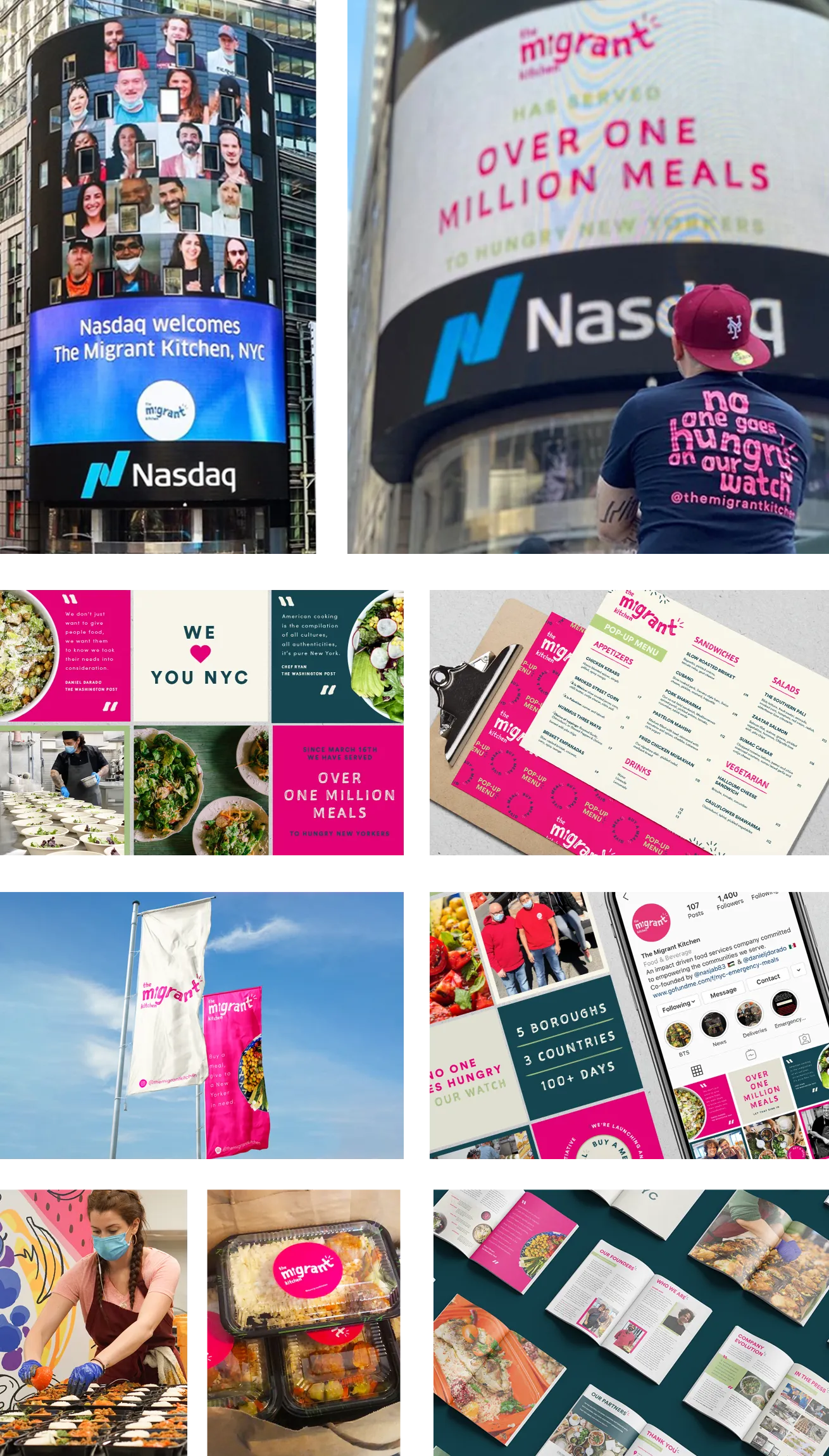 Creating the brand assets for The Migrant Kitchen. A catering company focused on providing meaningful opportunities for undocumented immigrants to make a fair wage while receiving professional culinary training. Further expanded its mission by responding to the urgent need: delivering meals to healthcare workers on the front lines of the COVID-19 pandemic. Assets included social posts, magazine, storyboarding a 30-second video on the 7- story tall Nasdaq Video Tower and Marquee in New York where the team was serving 60,000 meals a week as part of the GetFoodNYC program, cooking for vulnerable seniors, mosques, various NYC/NJ shelters and more.